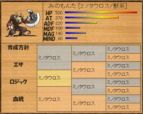 LMに着手したきっかけは「ブリーディングゲーム(配合とか)作りたい」というところからきただけあって、配合理論とか考えるのは楽しいです。実際プログラムにはしていないもののアイデアはたくさん。しっかし・・・戦闘が、なんというか普通すぎるかなぁ、と。結局のところ戦闘が楽しいから強いモンスターを作りたくなるのであって、戦闘がふつーだと飽きられるんじゃないかと思うんですよねぇ。さくっとはらはら戦闘がベスト!なんですが、ん~む。